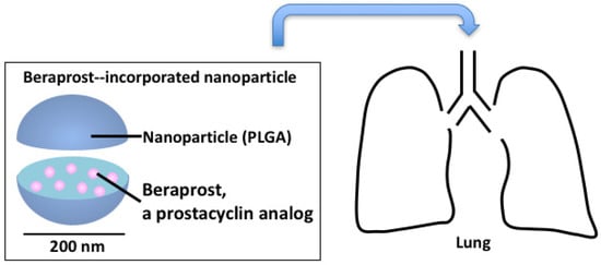 We investigated the efficacy and safety of intratracheal administration of NPs incorporated with beraprost, a prostacyclin analog (beraprost-NPs) in Sugen-hypoxia-normoxia and monocrotaline (MCT) rat models of PAH (Figure 1) [26]. Nanoparticles of polylactide-glycolide (PLGA), a polymer, encapsulated with beraprost were used in the study. After a single administration, beraprost-NPs significantly decreased right ventricular pressure, right ventricular hypertrophy, and pulmonary artery muscularization in both rat models. Beraprost-NPs significantly improved the survival rate in the MCT rat model. No infiltration of inflammatory cells, hemorrhage, or fibrosis was found in the liver, kidney, spleen or heart after the administration of beraprost-NPs.
