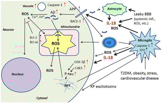 IL-18 has a role in Aβ generation and hyperphosphorylation of tau. Microglia and astrocytes, activated by multiple factors, produce IL-18 in the brain. IL-18 may also enter the brain through a leaky BBB, driven by systemic inflammation and ROS. IL-18 can enhance protein levels of APP, BACE-1 and Aβ, as well as GSK-3β and Cdk5, which are involved in tau hyperphosphorylation. IL-18 also increases vacuolization of neurons. Further, IL-18 seems to also increase ROS production in the cells. ROS in turn can activate caspase-1 and inflammasome system that can lead to further production of IL-18 and neuronal apoptosis. Red arrow, influenced by IL-18 [40,42].