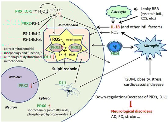 PRXs and DJ-1 in regulation of ROS and Aβ. Some of the PRXs are induced by IL-18, either directly or indirectly, whereas DJ-1 is down-regulated by IL-18 in neuron-like cells. Lack or inactivation of these ROS modulators and mitochondria protectors can lead to neurodegeneration. Red arrow, influenced by IL-18 [40,42].