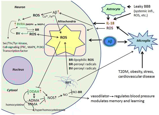 Protein levels of DDAH are increased in the frontal lobes of AD patients, which can partially be driven by IL-18 [40]. DDAH is involved in the regulation of cellular methylarginine concentration by hydrolyzing N(G), N(G)-dimethyl-l-arginine (ADMA) and N(G)-monomethyl-l-arginine (MMA). Both ADMA and MMA act as inhibitors for nitric oxide synthase (NOS) [70,71]. When these endogenous NOS inhibitors are catabolized by DDAH, NOS activity and NO production can be increased resulting in nitrosative stress, leading to neuronal and synaptic dysfunction. However, NO also has a vital role in synaptic plasticity, and is therefore important to the modulation of memory and learning [70]. In addition, the ADMA/DDAH pathway regulates angiogenesis [72], whilst NO functions as a vasodilator, thereby regulating blood pressure [73]. However, the activity of DDAH gets impaired by OS, inflammatory cytokines and/or hyperhomocysteinemia leading to accumulation of ADMA. The byproduct of ADMA synthesis is homocysteine, with hyperhomocysteinemia being a risk factor for cardiovascular disease, stroke and dementia [74,75]. Figure 3 summarizes the impact of IL-18 on BVRA and DDAH.