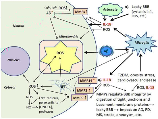 The multiple roles of MMPs in neurodegeneration. ROS are powerful inducers of MMPs, and induction can lead to leakage in BBB with harmful consequences. On the other hand, MMPs can degrade Aβ and reduce ROS production. Red arrow, target regulated by IL-18 [40,42].