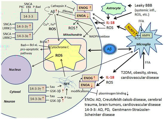 ENOs and 14-3-3 in neurodegeneration. Glycolytic ENOs also have a role in degradation of Aβ, mediated by plasmin. 14-3-3 proteins can regulate aggregation of SNCA [128,129], as well as influence hyperphosphorylation of tau [125]. ROS, generated for instance by Aβ and NFT, can deteriorate mitochondria leading to release of cytochrome C and initiation of pro-apoptotic pathway. As the 14-3-3 proteins, SNCA can interact with PKC, ERK and P-Bad [123]. Free Bad can interact with Bcl-xL, which leads to the release of cytochrome C from mitochondria and the initiation of the pro-apoptotic pathway [132]. Red arrow, influenced by IL-18 [40,42].