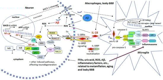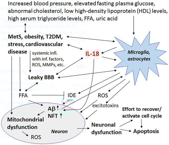 MetS and its role in neurodegeneration. IL-18 and OS, linked to AD and conditions that are associated to MetS, have multiple impacts on targets related to these conditions. Further, hallmarks of MetS have multiple harmful influences on microglia, astrocytes and neurons, which can lead to increase in Aβ production and NFT formation, and eventually, neuronal loss. Crucial players in this process can be IL-18 and ROS. However, inflammatory changes caused by MetS are often called metaflamation, which is a feverless inflammation. The term metaflamation also draws intention to multiple environmental and lifestyle issues, which is mainly generated by an excess of nutrients and metabolic tissue-driven cytokines. The chronic low grade inflammation often causes fatigue, cognitive impairment, sleep alterations, chronic pain and depression, frequently evident in AD as well as in MetS and related disorders.