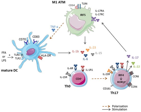 - Stelzner, K.; Herbert, D.; Popkova, Y.; Lorz, A.; Schiller, J.; Gericke, M.; Kloting, N.; Bluher, M.; Franz, S.; Simon, J.C.; et al. Free fatty acids sensitize dendritic cells to amplify Th1/Th17 cell-immune responses. Eur. J. Immunol. 2016, 46, 2043–2053. [Google Scholar] [CrossRef] [PubMed]