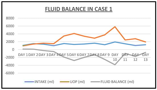 Fluid balance with total intake and urine output in Case 1 during the index admission.