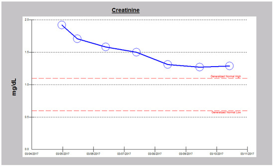 Falling serum creatinine in Case 1 following intravenous decongestive diuresis, 4–11 March 2017.