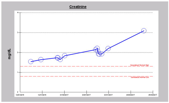 Worsening serum creatinine trajectory in Case 2 leading to the admission in mid-May 2017.