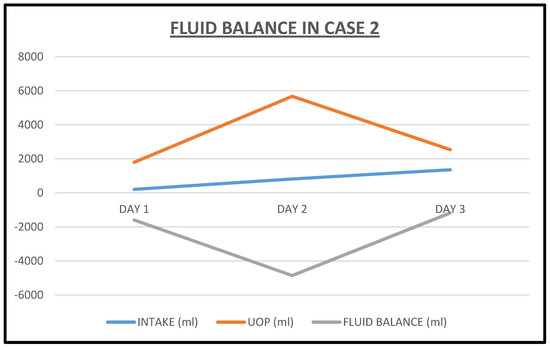 Fluid balance with total intake and urine output in Case 2 during the index admission.