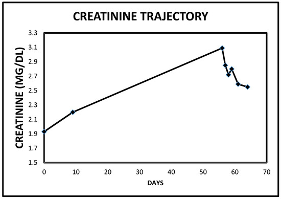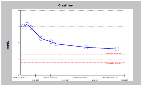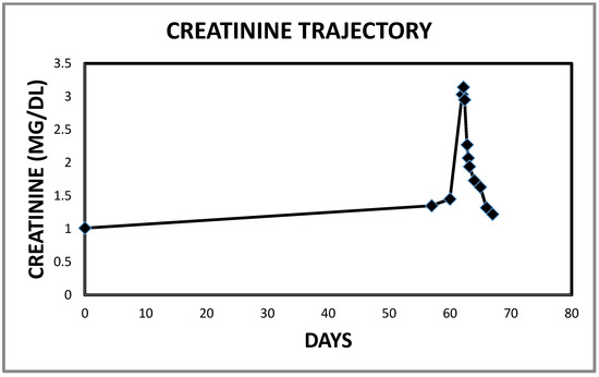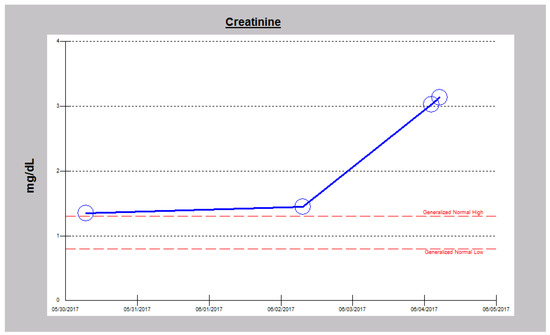 Worsening serum creatinine trajectory in Case 3 leading to the admission in early June 2017.
