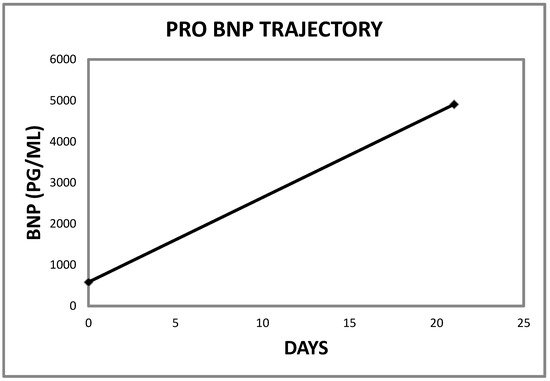 Finally, we would wish to emphasize our thrilling observation that all three patients had demonstrated recently rising Pro B Nat Peptide levels prior to each presentation (Table 1, Figure 16, Figure 17, Figure 18 and Figure 19). As a result of these observations, we have proposed a hypothesis that rapidly rising Pro B Nat Peptide levels in patients presenting a priori with cardiorenal syndrome should be seen as a sign of rapidly increasing right atrial pressure and as a result, the subsequent worsening congestive renal failure secondary to renal venous hypertension and therefore is a predictor of positive response to aggressive decongestive diuresis. Moreover, the often more than logarithmic escalations of Pro B Naturetic Peptide level that were observed within short periods of time prior to presentation in our three patients, we posit, is further confirmation of the very heightened central venous pressures operational in these patients on admission that would have clearly translated to exaggerated renal venous hypertension leading to “congestive renal failure” as designated by Ross in 2012 [1]. Of note, among hemodialysis patients, high Pro B Nat Peptide levels have been associated with mortality and generally is known to trend with volume overload [13,14,15,16]. The association of accelerated Pro B Nat Peptide levels with renal and/or mortality outcomes in cardiorenal syndrome not on hemodialysis are unknown. Specific targeted trials are warranted.
