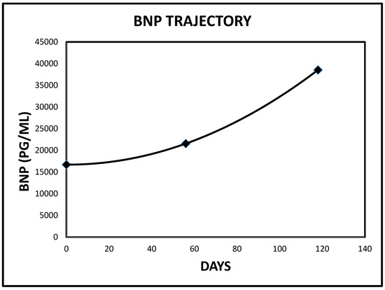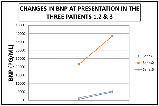 Changes in BNP levels in the three patients at presentation versus the penultimate BNP value.