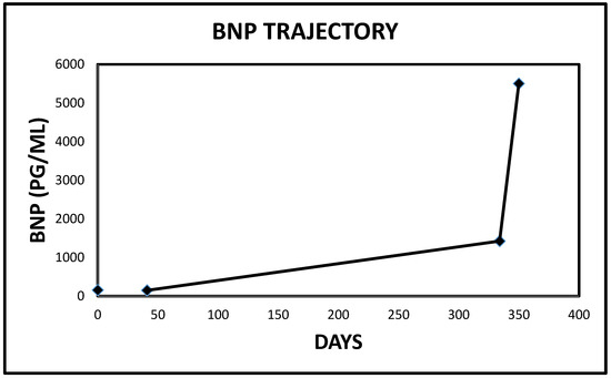 Pro B Nat Pep trajectory in Case 1 immediately preceding the index admission (Reference range for Pro B Nat Pep ≤ 450 pg/mL).