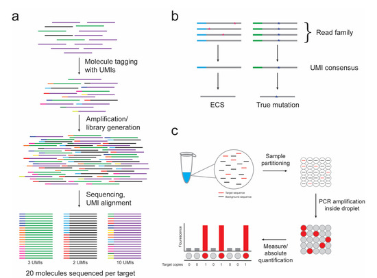 To remediate these obstacles, the use of random barcodes or unique molecular indexes (UMIs) has been introduced to various NGS methods [34,35,36,37,38,39,40]. UMIs can be designed as a string of completely random, partially degenerate, or defined nucleotides, depending on the number of template molecules to be identified. Sample preparation involves the introduction of a UMI to each target molecule prior to PCR amplification. PCR progeny (read family) of a single target molecule can be identified by aligning common UMIs (Figure 1a). This method allows for a digital measurement of each target molecule, thus removing bias introduced by PCR amplification and allowing for the accurate quantification and comparison of targets.