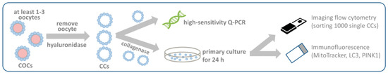 - Ogino, M.; Tsubamoto, H.; Sakata, K.; Oohama, N.; Hayakawa, H.; Kojima, T.; Shigeta, M.; Shibahara, H. Mitochondrial DNA copy number in cumulus cells is a strong predictor of obtaining good-quality embryos after IVF. J. Assist. Reprod. Genet. 2016, 33, 367–371. [Google Scholar] [CrossRef] [PubMed]