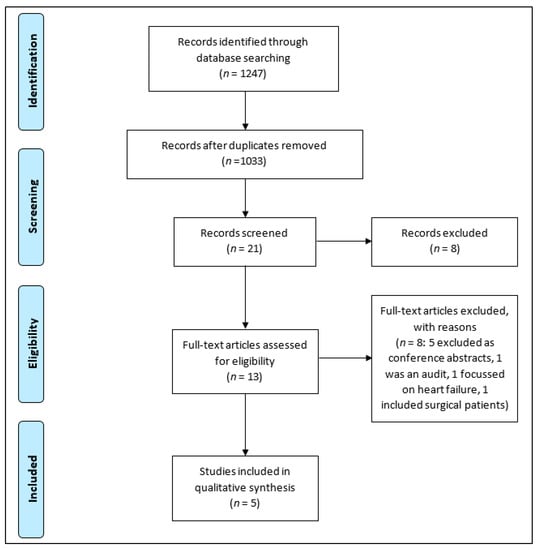 The search results are summarised in Figure 1. In total, 1033 studies were identified from the initial search. Of these, 13 studies were deemed potentially eligible. After review of full texts, five studies met the eligibility criteria and were included.