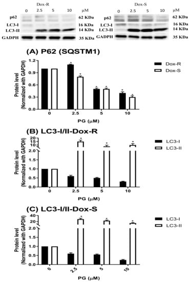 Alteration of autophagic marker levels in Dox-R and Dox-S cells after PG treatment. Protein levels of (A) p62 (SQSTM1), LC3-I/II in (B) Dox-R and (C) Dox-S were analyzed after PG treatment by Western blotting. Protein levels were represented as mean ± SD from 3 independent glyceraldehyde 3-phosphate dehydrogenase (GAPDH)-normalized chemiluminescent experiments. *, p < 0.05 compared with untreated control.