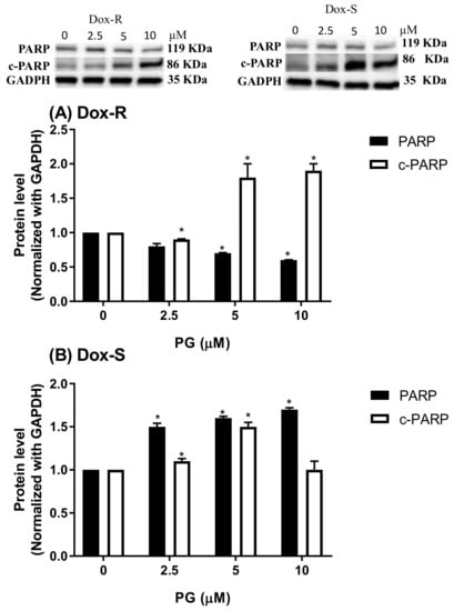 Expression of poly ADP ribose polymerase (PARP) levels in (A) Dox-R and (B) Dox-S cells after PG treatment. Non-cleaved PARP (PARP) and cleaved-PARP (c-PARP) levels after PG treating were measured by Western blotting and all chemiluminescent intensity were normalized with GAPDH. Results were shown as mean ± SD with 3 independent experiment. *, p < 0.05 compared with untreated control.
