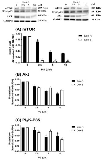 Autophagic inhibitor level change in Dox-R and Dox-S cells after PG treatment. (A) mammalian target of rapamycin (mTOR), (B) protein kinase B (Akt), and (C) phosphatidylinositol-4,5-bisphosphate 3-kinase-p85 (PI3K-p85) protein levels were determined by chemiluminescent Western blotting and normalized with GAPDH. Results were shown as mean ± SD in 3 independent experiments. *, p < 0.05 compared with untreated control.