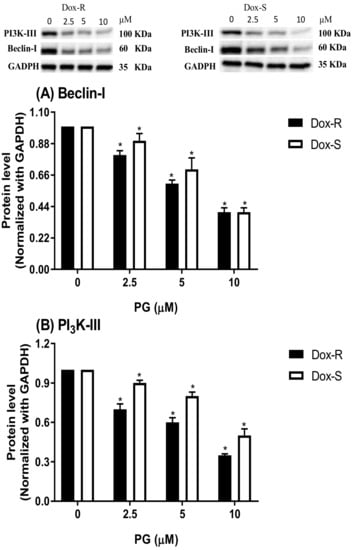 Alteration of autophagic inducer levels in Dox-R and Dox-S cells after PG treatment. (A) Beclin-1 and (B) PI3K-III were measured by Western blotting and normalized with GAPDH. Results were represented as mean ± SD from 3 independent experiments. *, p < 0.05 compared with untreated control.
