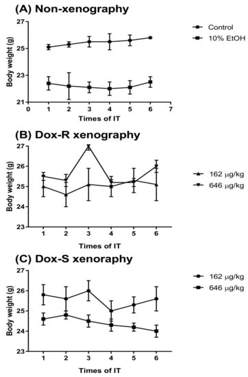 The body weight of the Dox-R and Dox-S xenograft mice during treatment with PG. (A) Non-xenograft, (B) Dox-R xenograft, and (C) Dox-S xenograft mice treatment with PG (162 and 646 μg/kg B. wt) or 10% EOH by intra-tracheal (IT) injection once every 5 days and measured body weight at each time of IT injection. Results were represented as mean ± SD of 6 mice in each group.