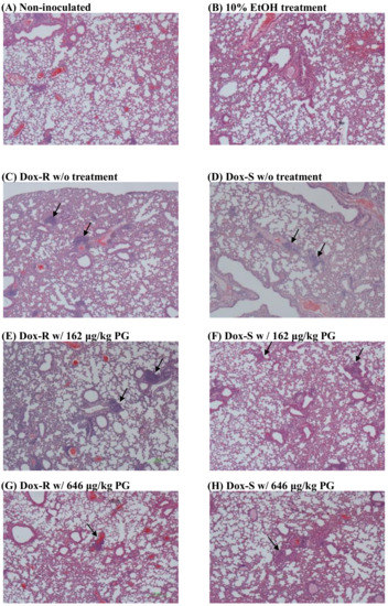 Animal experiments were approved by the National Dong Hwa University Animal Ethics Committee and the experimental protocols used were according to the “Guide for the Care and Use of Laboratory Animals” of National Dong-Hwa University. We used six males per group, 6–8 week-old mice of C57BL/6; they were weighed, and lung cancer was induced by intra-tracheal (IT) injection. On day 0, 1 × 107 cells/animals of Dox-R and Dox-S were intra-tracheally injected into the mice using pentobarbital anesthetic every 7 days until day 21. Next, 162 μg/kg and 646 μg/kg of PG were IT injected once every 5 days from day 21 to 53. The mice were sacrificed, and the lungs, liver, kidney, and spleen were taken followed by fixing and hematoxylin and eosin staining.