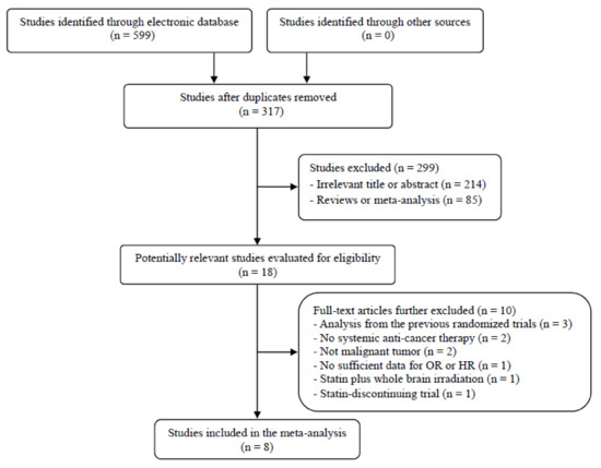 Based on these observations, randomized phase II or III clinical trials have been conducted to investigate the effect of adding statins to anticancer treatment in various types of cancer [30,31,32,33,34,35,36,37]. Whereas the first randomized trial of pravastatin in patients with hepatocellular carcinoma (HCC) reported a 9-month increase of overall survival (OS) [30], other randomized, controlled trials failed to demonstrate a significant improvement of clinical outcomes in patients treated with statin in combination with anticancer agents [31,32,33,34,35,36,37]. However, the results were inconclusive because some studies had a small sample size with a lack of blinding. Therefore, we conducted this meta-analysis of randomized, controlled trials to evaluate the effect of statin added to systemic anticancer therapy.