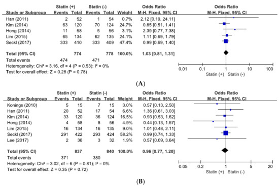 From seven studies [31,32,33,34,35,36,37], 1677 patients were included in pooling ORs with 95% CIs for ORR. There was no significant heterogeneity across the studies (X2 = 3.02, p = 0.81, I2 = 0%) and the fixed-effect model was used. The addition of statin to anticancer agents did not increase ORR (OR = 0.96, 95% CI: 0.77–1.20, p = 0.72) (Figure 2B).