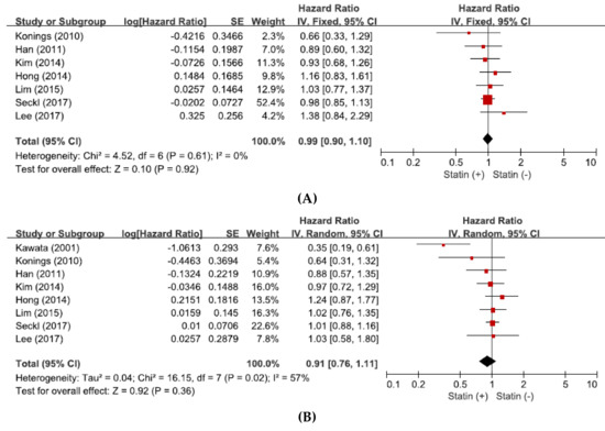 From seven studies [31,32,33,34,35,36,37], a total of 1677 patients were included in the pooled analysis of HRs with 95% CIs for PFS. Because there was no significant heterogeneity among the studies (X2 = 4.52, p = 0.61, I2 = 0%), the fixed-effect model was selected. The addition of statin to anticancer agents showed no significant impact on PFS (HR = 0.99, 95% CI: 0.90–1.10, p = 0.92) (Figure 3A).