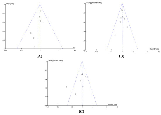 We did not perform a publication bias test for grade 3–5 AEs because of a limited number of studies included. Visual inspection of the funnel plots for ORR (Figure 4A), PFS (Figure 4B), and OS (Figure 4C) indicated that there was no substantial publication bias. Egger’s tests also demonstrated the absence of significant publication biases (p = 0.198 for ORR, p = 0.991 for PFS, and p = 0.126 for OS, respectively).