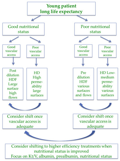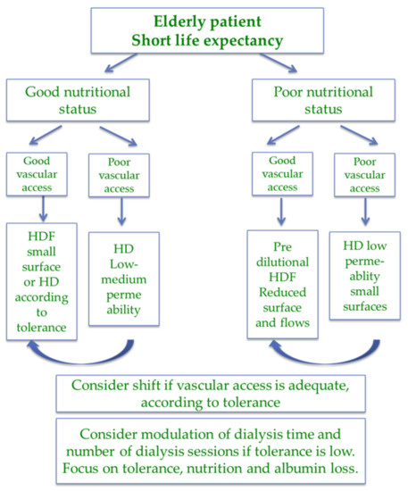 Well-functioning vascular access is of obvious importance in dialysis and is a requisite for HDF [158,159,160,161,162,163]. While the imperative “fistula first” is still valid for patients with a longer life expectancy, poor vascular patrimonies, severe cardiac disease, chronic hypotension, hypercoagulability, and the failure of previous artero-venous (AV) fistulae or grafts increase the need for permanent catheters. In older patients, a distal, native AV fistula may not be feasible. Algorithms based on age and comorbidity now often privilege permanent catheters in elderly patients with a short life expectancy and suggest considering prosthetic or proximal fistula as a first option in patients with intermediate characteristics [164,165,166,167,168].
