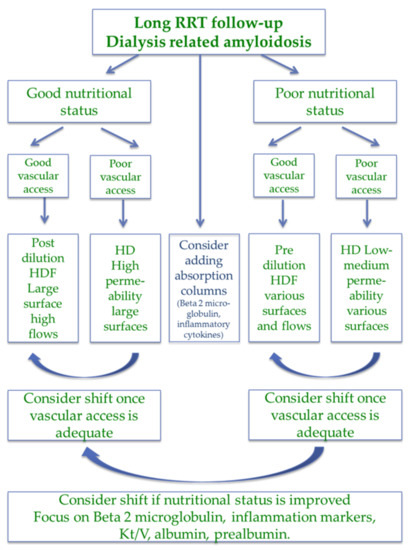 The advantages of high-efficiency HDF are less evident in older patients with shorter life expectancy, in which HD may be a reasonable choice, in particular when residual renal function is present; these patients may fail compensating for albumin loss, and shorter life expectancy makes it unlikely that they will develop dialysis-related amyloidosis, which generally takes at least ten years to become clinically evident [100,101,102,103,104,105].