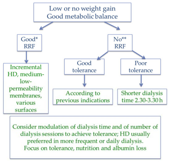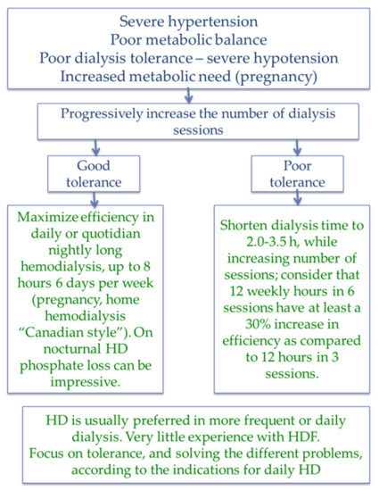 At dialysis start, incremental policies allow us to test for tolerance, starting with once- or twice-weekly sessions of 2–3 h, and progressively increasing frequency or duration according to need for increasing depuration or ultrafiltration and to tolerance [37,38,39,40,41,123,124,125,126,127,128,129] (Figure 6).