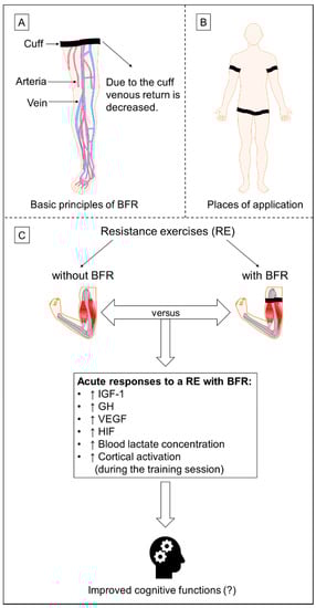 Schematic illustration of (A) the basic principles of blood flow restriction, (B) the application places of the cuffs for blood flow restriction and (C) the possible neurobiological mechanisms of resistance training with blood flow restriction that are likely to contribute to improved cognitive functions; blood flow restriction (BFR), growth hormone (GH), hypoxia-inducible factor (HIF), insulin-like growth factor 1 (IGF-1), resistance training (RE), vascular endothelial growth factor (VEGF).
