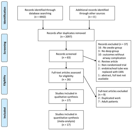 Searches of electronic databases retrieved 4442 potentially eligible reports published up to October 2017. After retrieving the full text of the relevant studies, 2345 records were excluded for duplicated work. A total of 2034 records were excluded after initial screening; by examining titles and another 37 records were excluded because they were not RCT, did not report airway complications, did not compare between deep and awake status and used different emergence technique. Another seven trials were excluded since they were studies of adult patients. A total of 17 full-text randomized trials [,,,,,,,,,,,,,,,,] were included in the final analysis (Figure 1).