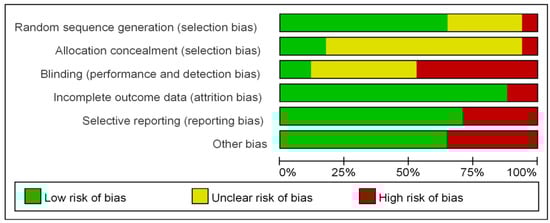 Two independent authors (C.-H.K., J.-H.R.) evaluated the methodological quality and risk of bias of the included studies, using the Cochrane Risk of Bias tool for assessing the risk of bias of randomized trials []. The Cochrane tool assesses domains, including selection bias, performance bias, detection bias, attrition bias, reporting bias, and other sources of bias and, for each individual domain, classifies studies into low, unclear, and high risk of bias. Disagreements were resolved by consensus and a third author (S.H.C.) adjusted the discrepancy if agreement could not be achieved. A risk of bias graph was constructed to present the results.