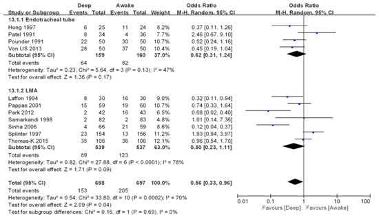Overall airway complications. Overall airway complications were reported in 11 studies including 1395 patients (Figure 3) [,,,,,,,,,,]. The risk of overall airway complications were lower in deep extubation group than awake extubation group (OR 0.56, 95% CI 0.33–0.96, p = 0.04). A moderate level of heterogeneity among the studies existed (I2 = 70%, p = 0.0002).