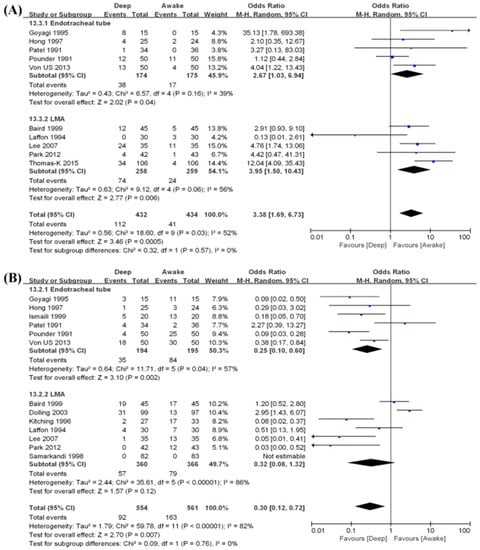 Airway obstruction. Airway obstruction was reported in five endotracheal tube studies [,,,,] including 349 patients and in five LMA studies [,,,,] including 517 patients (Figure 4A). For endotracheal tube patients, the risk of airway obstruction was higher in deep extubation group than awake extubation group (OR 2.67, 95% CI 1.03–6.94, p = 0.04) with a low level of heterogeneity among the studies (I2 = 39%, p = 0.16). For LMA patients, the risk of airway obstruction was also higher in deep extubation group than awake extubation group (OR 3.95, 95% CI 1.50–10.43, p = 0.006) with a moderate level of heterogeneity among the studies (I2 = 50%, p = 0.06)