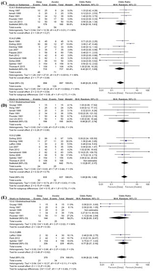 Forest plot of comparison. Deep extubation (experimental) vs. Awake extubation. (control). Outcome: (A) Airway obstruction, (B) cough, (C) desaturation, (D) laryngospasm, and (E) breath-holding.