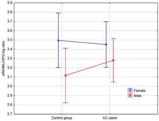 The influence of two independent factors (gender and AC use) on the level of sRANKL/OPG (dependent variable) log ratio is shown on Figure 1. It was found, that AC use did not significantly affect the level of sRANKL/OPG log ratio (p < 0.658), while the level of sRANKL/OPG log ratio was higher in both female groups (AC users and controls) in comparison to both male groups (p < 0.045). When compared with the Fisher’s LSD test, the RANKL/OPG log ratio had a trend to increase on the border of significance in female controls compared to male controls (p < 0.074) (Table 2).