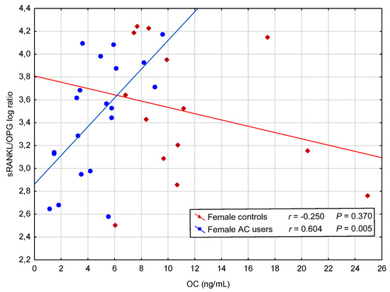 However, further analysis showed positive correlations in female AC users between OC and RANKL log, and between OC and RANKL/OPG log ratio (Figure 2), and a negative correlation between OC and OPG. In contrast, in male AC users, a positive correlation between concentration of OC and OPG was observed (Table 3).