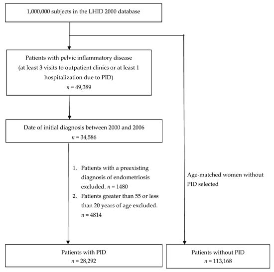 The subject selection process is illustrated in Figure 1. After analyzing claims filed by 1,000,000 individuals during the 12-year period from 2000 to 2011, we identified 49,389 individuals who had at least three ambulatory claims or at least one inpatient claim with a diagnosis of pelvic inflammatory disease (ICD-9-CM: 614.3–614.9). Individuals with an initial date of diagnosis during the period from 2000 to 2006 were selected. The initial date of diagnosis was defined as the date of the first outpatient or inpatient visit. Patients with a pre-existing diagnosis of endometriosis were then excluded. Patients greater than 55 or less than 20 years of age were also excluded. A total of 28,292 patients with pelvic inflammatory disease were included in the PID cohort. For each patient with PID, four women in the same five-year age group without an existing diagnosis of PID or endometriosis were randomly selected from the same database.