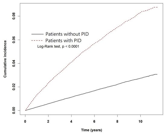 The Kaplan–Meier plot of the cumulative incidence of endometriosis in the PID and control cohorts is shown in Figure 2. The logrank test detected a significant difference between the incidence rates of endometriosis in patients with and without PID.