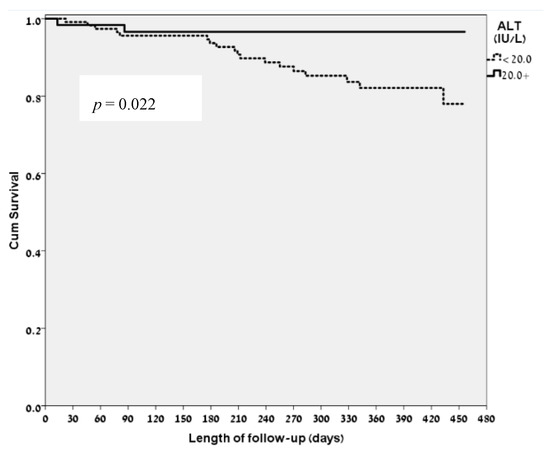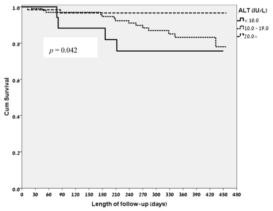 - Ramaty, E.; Maor, E.; Peltz-Sinvani, N.; Brom, A.; Grinfeld, A.; Kivity, S.; Segev, S.; Sidi, Y.; Kessler, T.; Sela, B.A.; et al. Low ALT blood levels predict long-term all-cause mortality among adults. A historical prospective cohort study. Eur. J. Intern. Med. 2014, 25, 919–921. [Google Scholar] [CrossRef] [PubMed]
