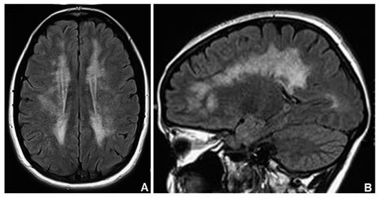 Brain magnetic resonance imaging (MRI) usually showed symmetric and confluent T2 hyper-intensities located in the cerebral white matter (with sparing of subcortical U-fibers) and, sometimes, in the cerebellar white matter in the splenium of the corpus callosum, in the basal ganglia, and in the thalami [29].