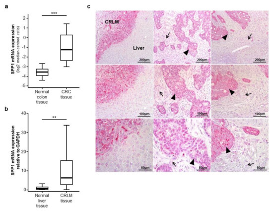 Osteopontin (SPP1) is overexpressed in colorectal liver metastases. (a) Osteopontin (SPP1) mRNA expression levels are strongly elevated in colorectal cancer (CRC) tumour samples compared to normal colon tissue samples (u-test, p (***) < 0.001); (b) SPP1 mRNA expression levels are significantly elevated in colorectal liver metastases (CRLM) tissue samples compared to normal liver tissue (u-test, p (**) < 0.01); (c) Immunohistochemical osteopontin staining in three exemplary CRLM samples (left, middle and right column). Left column: osteopontin is highly expressed in CRLM compared to normal liver tissue; middle and right column: tumour cells show a strong osteopontin expression (black arrow heads) while the peritumoral stromal tissue displays a weak osteopontin signal (black arrows); (upper panel: 100-fold magnification, middle panel: 200-fold magnification, lower panel: 400-fold magnification).