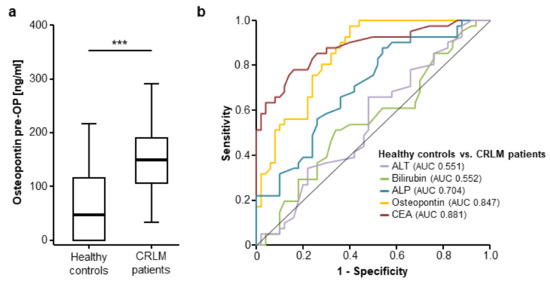 Circulating levels of osteopontin are elevated in patients with CRLM. (a) Circulating osteopontin levels are significantly elevated in patients with CRLM compared to healthy controls (u-test, p (***) < 0.001); (b) Osteopontin levels show a similar diagnostic power compared to carcinoembryonic antigen (CEA) serum levels in receiver operating characteristic (ROC) curve analysis, while serum levels of bilirubin, alkaline phosphatase (ALP) and alanine aminotransferase (ALT) are unsuitable for the differentiation between CRLM patients and healthy controls.