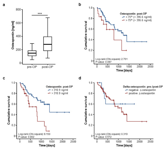 Postoperative osteopontin serum levels are associated with the patients’ prognosis. (a) Circulating osteopontin levels are significantly higher after tumour resection compared to preoperative levels (Wilcoxon signed-rank test, p (***) < 0.001); (b) Patients with postoperative osteopontin serum levels above the 75th percentile display a trend towards an impaired prognosis (log-rank test, p = 0.097); (c) At our ideal cut-off of 310.9 ng/mL, postoperative osteopontin concentrations significantly discriminate between patients with good or poor prognosis (log-rank test, p = 0.002); (d) Longitudinal changes of osteopontin serum concentrations before and after tumour resection are unsuitable to predict patients’ outcome (log-rank test, p = 0.572).