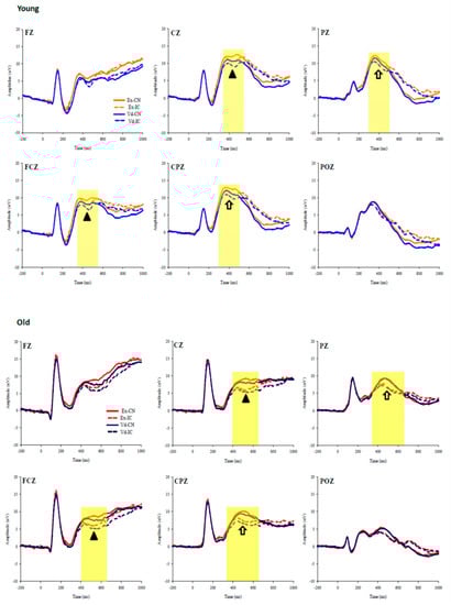 The N450 mean amplitude was derived by calculating the mean amplitude value within the 350- to 550-ms, and 400- to 650-ms time windows after stimulus onset for young and older adults, respectively. Likewise, the P3 mean amplitude was obtained by taking mean values within the 300- to 500-ms and 350- to 650-ms time windows after stimulus onset for young and older adults, respectively. These time windows were selected based on previous studies [19,46,48,49] and visual inspection of the grand-averaged waveforms (Figure 1).
