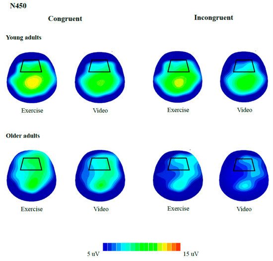 Topographic distributions of the N450 component in young (350–550 ms) and older adults (400–650 ms). Distribution (spectrum: Blue to red) is illustrated for the congruent and incongruent trials as modulated by exercise, with areas squared represent the frontocentral regions.