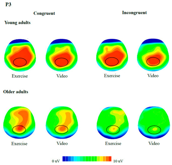 Topographic distributions of the P3 component in young (300–500 ms) and older adults (350–650 ms). Distribution (spectrum: Blue to red) is illustrated for congruent and incongruent trials, with or without exercise, with the centroparietal regions circled.